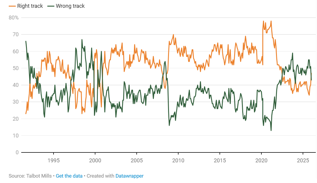 Such poor polling has put an end to the hopes of three of the last four governments. Since 1991, pollsters Talbot Mills have – in various guises – asked the public a simple question: is the country on the right or the wrong track? And the results trace a fairly regular pattern.